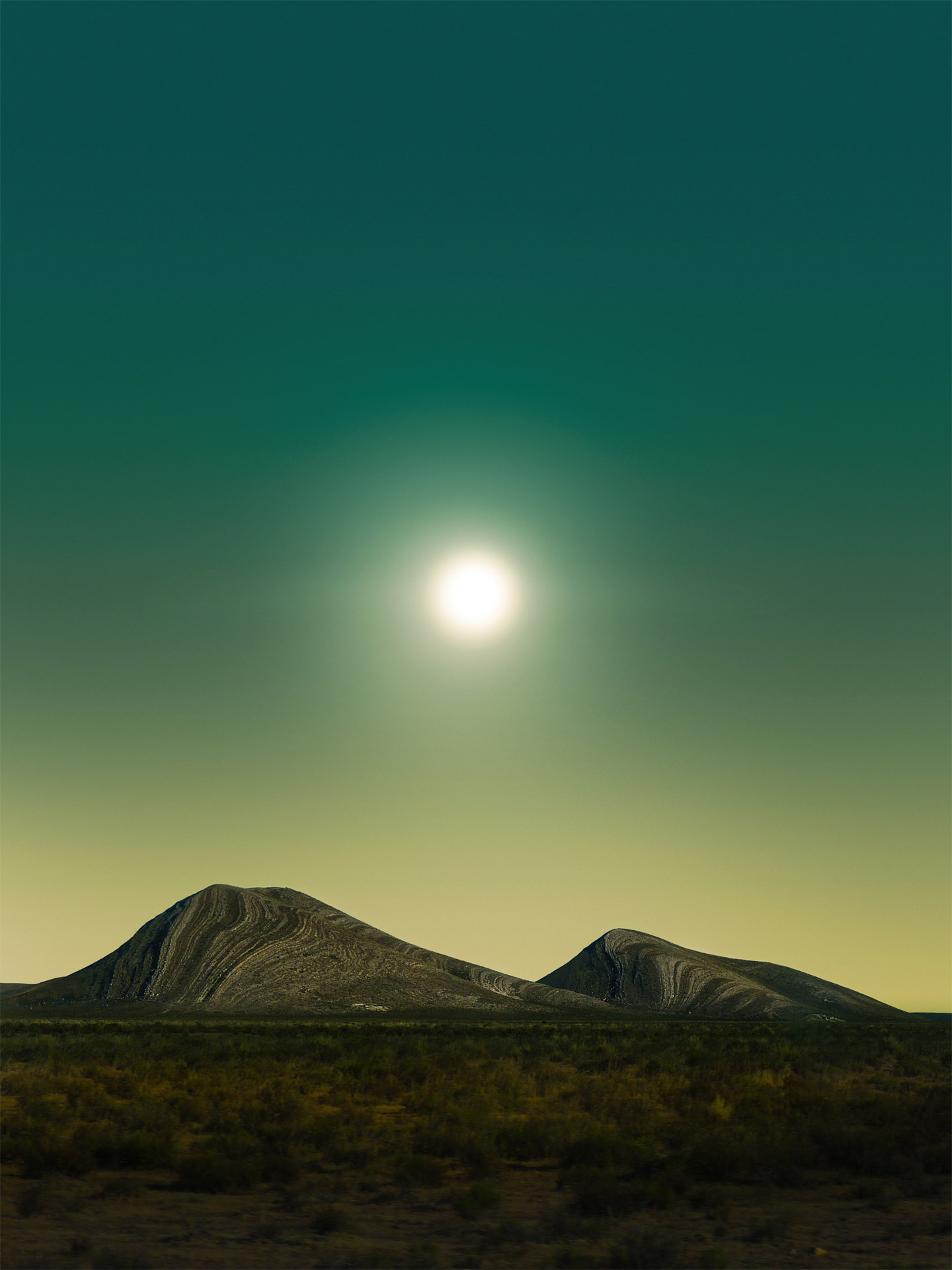 Ambos cerros solitarios rodeados de una atmósfera extraña, casi irreal, bajo la intensidad de un sol resplandeciente y enceguecedor.